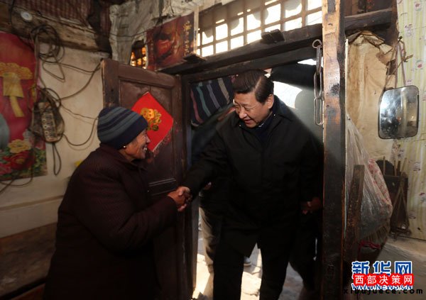 2012年12月29日至30日,中共中央總書記、中央軍委主席習(xí)近平在河北省阜平縣看望慰問(wèn)困難群眾。這是習(xí)近平在龍泉關(guān)鎮(zhèn)駱駝灣村到困難群眾唐榮斌家看望。新華社記者蘭紅光攝