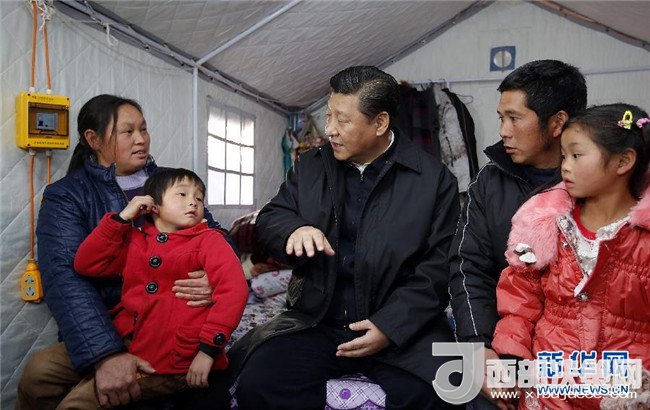 2015年1月19日至21日,中共中央總書記、國家主席、中央軍委主席習(xí)近平來到云南昭通、大理、昆明等地,看望魯?shù)榈卣馂?zāi)區(qū)干部群眾,深入企業(yè)、工地、鄉(xiāng)村考察,就災(zāi)后恢復(fù)重建和經(jīng)濟(jì)社會(huì)發(fā)展情況進(jìn)行調(diào)研。這是1月19日,習(xí)近平來到魯?shù)榭h小寨鎮(zhèn)甘家寨紅旗社區(qū)過渡安置點(diǎn),走進(jìn)鄒體富老兩口和孫子住的帳篷,詢問家里吃飯、補(bǔ)助、收入等問題。新華社記者 張鐸 攝