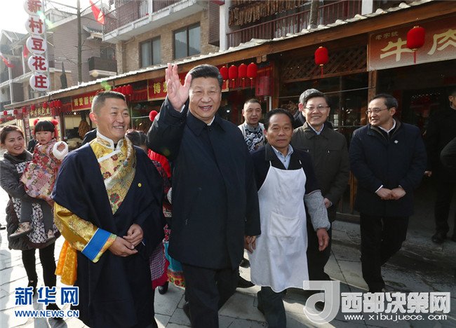 這是2018年2月12日上午,習(xí)近平在阿壩藏族羌族自治州汶川縣映秀鎮(zhèn)場鎮(zhèn)考察。 新華社記者 鞠鵬 攝