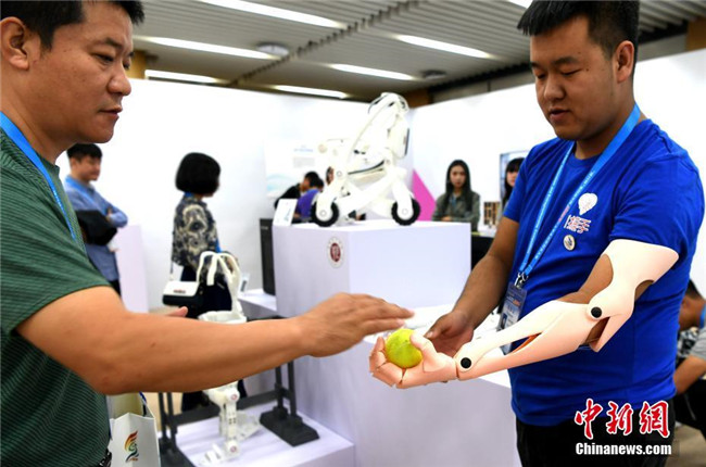 10月13日,第四屆中國“互聯(lián)網(wǎng)+”大學(xué)生創(chuàng)新創(chuàng)業(yè)大賽總決賽在廈門大學(xué)舉行。無人機(jī)、自助售飯機(jī)、人偶互動(dòng)、全息3D智能視頻、機(jī)器人輪椅、3D打印假肢手臂等大學(xué)生研發(fā)設(shè)計(jì)的產(chǎn)品亮相會(huì)場,以“90后”為主的創(chuàng)新創(chuàng)業(yè)生力軍已全面發(fā)力,釋放出“青年+創(chuàng)新創(chuàng)業(yè)”的無窮力量。圖為3D打印假肢手臂展示。中新社記者 王東明 攝