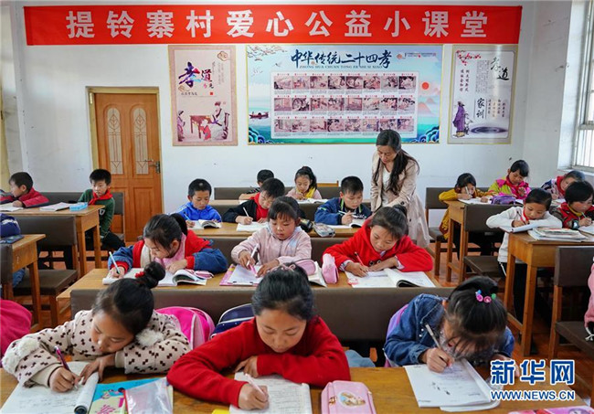 10月23日,李飛燕在提鈴寨村“愛心公益小課堂”為學(xué)生輔導(dǎo)功課。