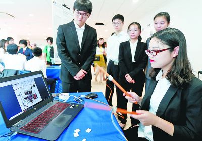 學(xué)生在上海交通大學(xué)舉辦的設(shè)計展上展示可進(jìn)行虛擬演奏的“空氣鼓”。新華社發(fā)