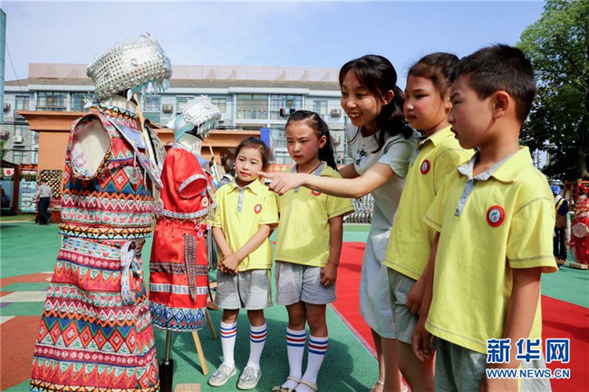 5月28日,家長和孩子們在展示不同民族的服飾。
