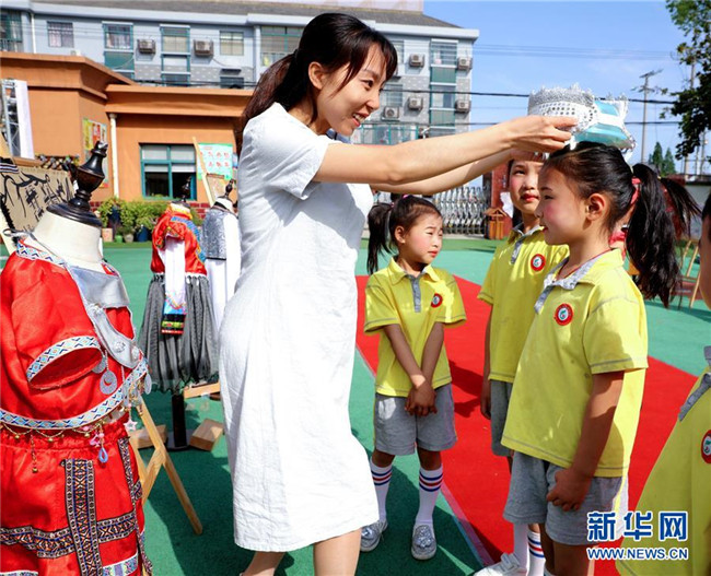 5月28日,老師給孩子們試戴民族頭飾。