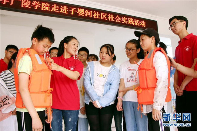 7月2日,揚州大學廣陵學院大學生志愿者為寶應縣子嬰河社區(qū)留守兒童講解救生衣的使用方法。新華社發(fā)(沈冬兵 攝)
