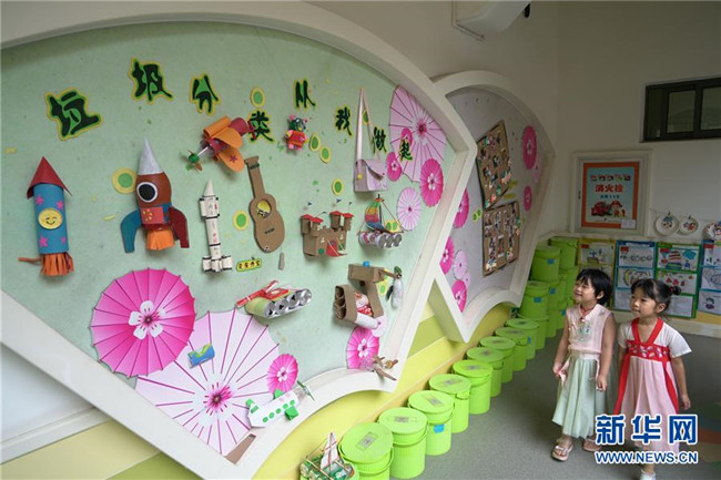 7月4日,德清縣乾元鎮(zhèn)第一幼兒園老師向孩子們展示廚余垃圾的標(biāo)志。新華社記者 馮大鵬 攝