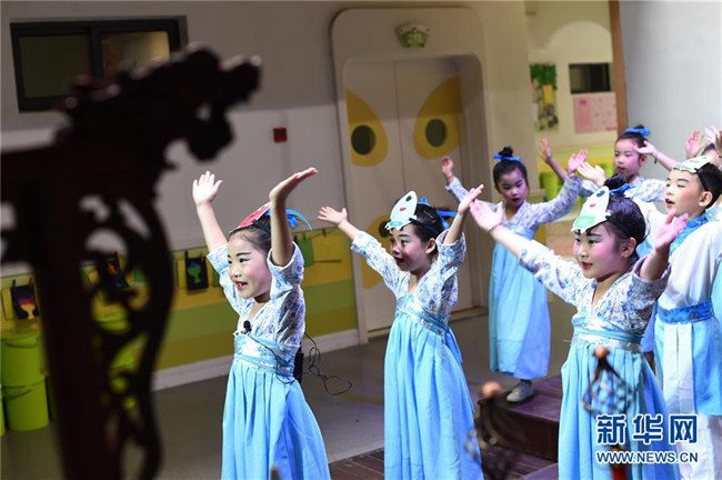 7月4日,德清縣乾元鎮(zhèn)第一幼兒園小朋友們在唱垃圾分類兒歌。新華社記者 郭緒雷 攝