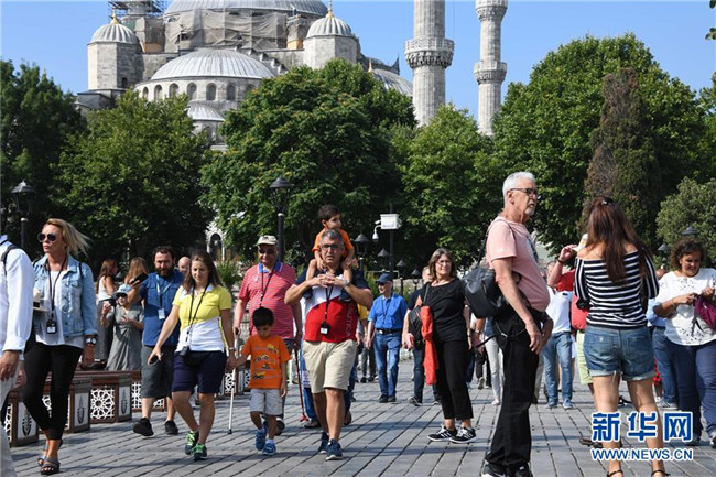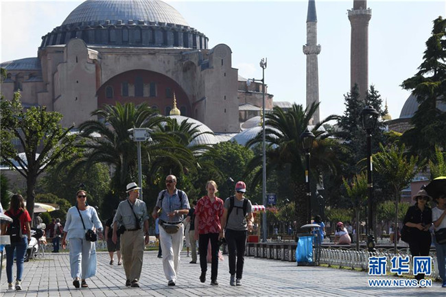 7月18日,在土耳其伊斯坦布爾,游客在一處旅游景點(diǎn)游覽。新華社記者 徐速繪 攝