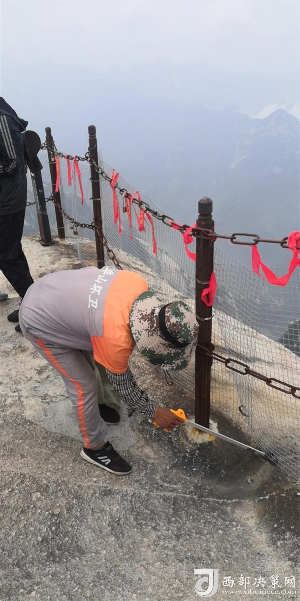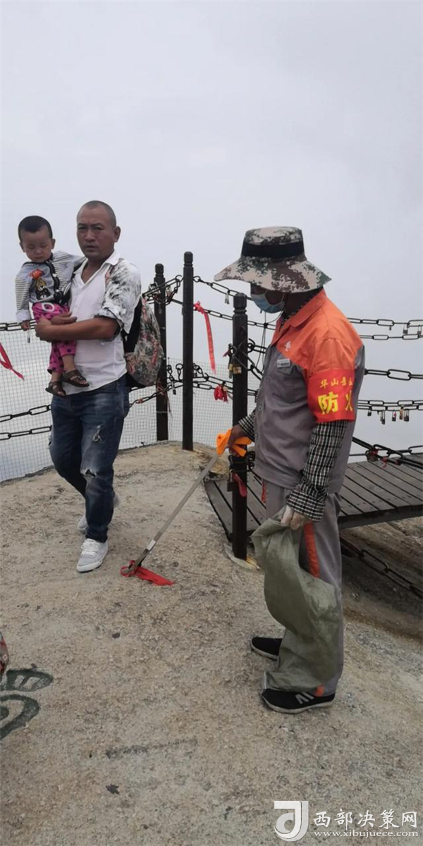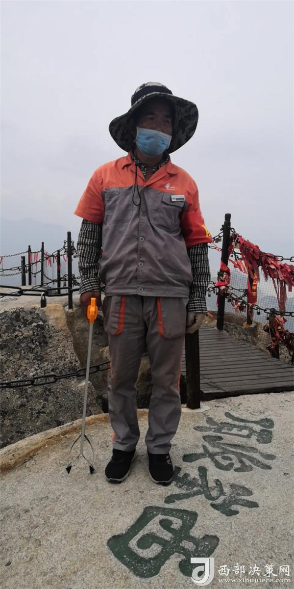 楊群社是景區(qū)一名環(huán)衛(wèi)工,負責(zé)華山西峰頂區(qū)域的衛(wèi)生保潔工作。為了給游客創(chuàng)造一個干凈整潔的游覽環(huán)境,熾熱的陽光下,楊群社在自己的區(qū)域內(nèi)不停地來回撿拾垃圾。