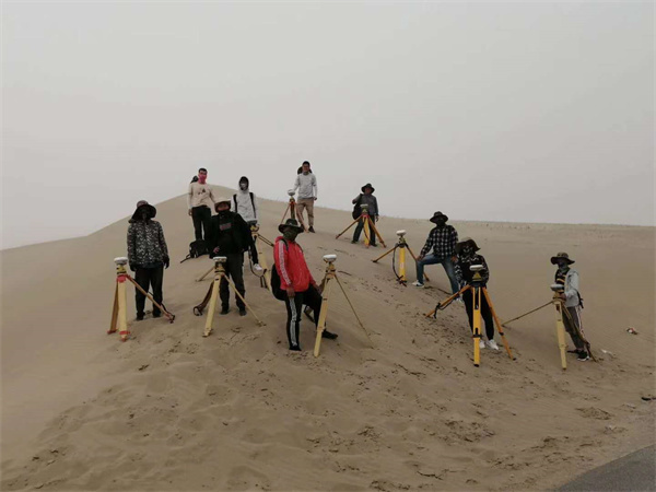 后來(lái),唐飛帶領(lǐng)團(tuán)隊(duì)又前往新疆若羌,為中鐵一局三公司和若鐵路項(xiàng)目進(jìn)行前期控制網(wǎng)復(fù)測(cè)。項(xiàng)目線路長(zhǎng)、地廣人稀,且地處塔克拉瑪干沙漠邊緣。為了節(jié)省時(shí)間,每天早上他和隊(duì)員背著馕、咸菜、礦泉水出發(fā),在沙漠戈壁一測(cè)就是十二個(gè)小時(shí),晚上八九點(diǎn)左右才能回去吃口熱飯。有一次,他們?cè)诠さ厣蠝y(cè)量時(shí),突遇沙塵暴,他和三個(gè)組員趕快收拾儀器,裝進(jìn)儀器箱,四個(gè)人圍在一起,等著沙塵暴過(guò)去。