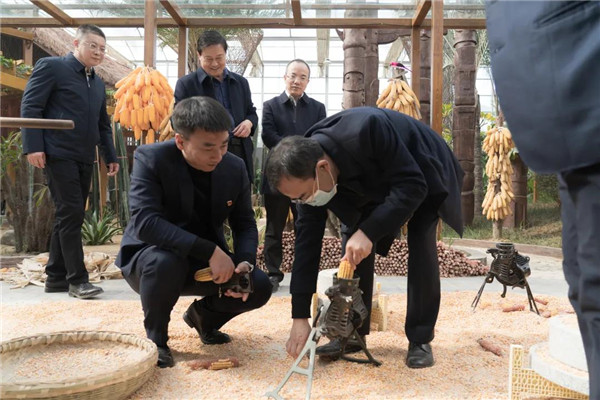 在上古農(nóng)耕文化、現(xiàn)代農(nóng)業(yè)科技與地方特色農(nóng)業(yè)相結(jié)合的神農(nóng)百草園里,高廳長饒有興趣的親自體驗農(nóng)事活動的玉米脫粒。調(diào)研組一行還參觀了各項高科技栽培種植及研學課堂區(qū)域。