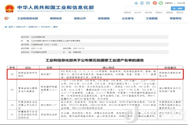 西部決策網(wǎng)訊(韓宗憲)12月13日,工業(yè)和信息化部公布了第五批國家工業(yè)遺產(chǎn)名單,西鳳酒釀酒工業(yè)遺產(chǎn)群作為唯一的中國白酒生產(chǎn)釀造項目同全國其他30家工業(yè)遺產(chǎn)一起進(jìn)入名單。這也是繼6月10日國家級非物質(zhì)文化遺產(chǎn)榜單發(fā)布以來,西鳳榮列的又一重磅國家級名單。既標(biāo)志了相關(guān)部門和廣大消費者對三千年無斷代西鳳酒釀造設(shè)備和釀造技藝的肯定,也表示出西鳳酒為中國白酒發(fā)展作出的突出貢獻(xiàn)。