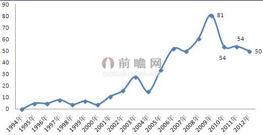 圖表11994-2012年我國(guó)外診斷行業(yè)專利申請(qǐng)量(單位:件)