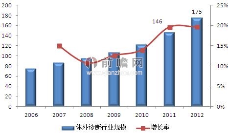 前瞻產(chǎn)業(yè)院《2013-2017年中國(guó)體外診斷行業(yè)市場(chǎng)需求預(yù)測(cè)與投資戰(zhàn)略規(guī)劃分析報(bào)告》數(shù)據(jù)顯示,2006年以來(lái),國(guó)內(nèi)體外診斷產(chǎn)業(yè)以15%左右的年增長(zhǎng)率呈現(xiàn)高速增長(zhǎng)態(tài)勢(shì)。據(jù)統(tǒng)計(jì),2008年我國(guó)體外診斷市場(chǎng)規(guī)模已達(dá)95億元,2010年增長(zhǎng)至122億元,2011年突破140億元,到2012年,我國(guó)體外診斷市場(chǎng)規(guī)模約為175億元。