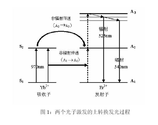 自然界中存在很多有機(jī)或無機(jī)物質(zhì),它們可以在電磁輻射激發(fā)下發(fā)射熒光或磷光,且在發(fā)光過程中遵守Stokes 規(guī)則,即發(fā)射光的波長長于激發(fā)光的波長。而在20 世紀(jì)70 年代,科學(xué)家們卻合成了一類可以反Stokes 規(guī)則產(chǎn)生磷光的特殊材料,即UCP。UCP 在紅外光區(qū)(波長>780nm)被激發(fā),卻可以發(fā)射波長遠(yuǎn)短于激發(fā)光的可見光(波長475nm-670nm),即能量上轉(zhuǎn)換。物質(zhì)構(gòu)成決定性質(zhì)特點(diǎn)。UCP 是由稀土金屬元素?fù)诫s于晶體的晶格中構(gòu)成的。在這種材料中有三種主要的成分:主基質(zhì)(Host Matrix)、吸收子(Absorber)和發(fā)射子(Emitter)。作為主基質(zhì)的晶體材料有:氧硫化物(如Y2O2S、GdO2SLa2O2S 等)、氟化物(如YF3、GdF3、LaF3 等)、鎵酸鹽(如YGaO3、Y3Ga5O12 等)以及硅酸鹽(如YSi2O5、YSi3O7 等)等;常用作吸收子的稀土金屬離子有:鐿離子(Yb3+)、鉺離子(Er3+)、釤離子(Sm3+)等;常用作發(fā)射子的稀土金屬離子有:鉺離子(Er3+)、鈥離子(Ho3+)、銩離子(Tm3+)、鋱離子(Tb3+)等。吸收子和發(fā)射子這一離子對在主基質(zhì)晶格內(nèi)適宜的空間取向和距離,是產(chǎn)生上轉(zhuǎn)換發(fā)光的基礎(chǔ)。上轉(zhuǎn)換發(fā)光的產(chǎn)生是一個涉及多個(至少兩個)光子的光學(xué)過程。在這個過程中(如圖1),UCP 內(nèi)的吸收子(如Yb3+)至少要吸收兩個低能量光子(紅外光區(qū),970nm),而后經(jīng)過一系列內(nèi)部能量轉(zhuǎn)換,以非輻射的形式(A1A2,A2A3)將這兩個光子的能量連續(xù)傳遞給發(fā)射子(如Er3+),以使其處于激發(fā)態(tài)(A3)。后者接著發(fā)生一個返回基態(tài)能級的躍遷,釋放一個高能光子(可見光區(qū),如525nm 540nm),完成能量上轉(zhuǎn)換。